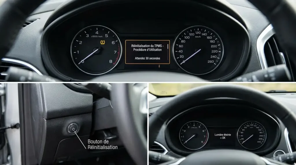 Sur Renault et Dacia, vous réinitialisez en mettant le contact, affichant « pression pneus set tpw » via le commodo, maintenant le bouton 3 secondes jusqu’à « set tpw lancé », puis roulant 10-15 km. Si le voyant persiste, vérifiez individuellement chaque pneu avec un manomètre, inspectez l’état visuel ou consultez un professionnel. Vérifiez la pression mensuellement à froid pour votre sécurité.