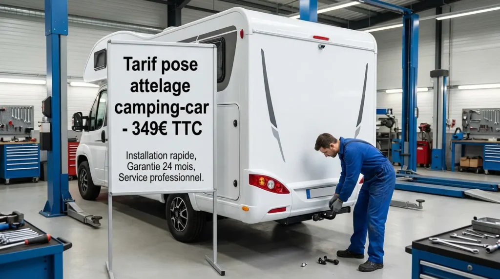 Pour les camping-cars intégraux et capucines, France Attelage facture un devis technique à 14,90 €, intégralement déduit du prix final si la commande se conclut. Ce devis couvre l’inspection du châssis et la confirmation de faisabilité de la pose.